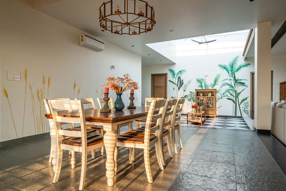 This farmhouse spans 3500 square feet and boasts three bedrooms, offering ample space for comfortable living. The expansive living area is perfect for hosting large gatherings, while the open dining and kitchen area promotes seamless movement and connectivity between spaces.